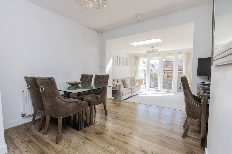 The heart of the home is the beautifully presented open plan living space, filled with natural light from windows to the front, French doors to the rear garden, and a dome roof skylight in the living area. The sleek, modern kitchen is fitted with wall and base units topped with a warm wooden worktop, integrated appliances, and space for an automatic washing machine. The adjoining dining area flows seamlessly between the kitchen and living room, and includes a door leading to the staircase.